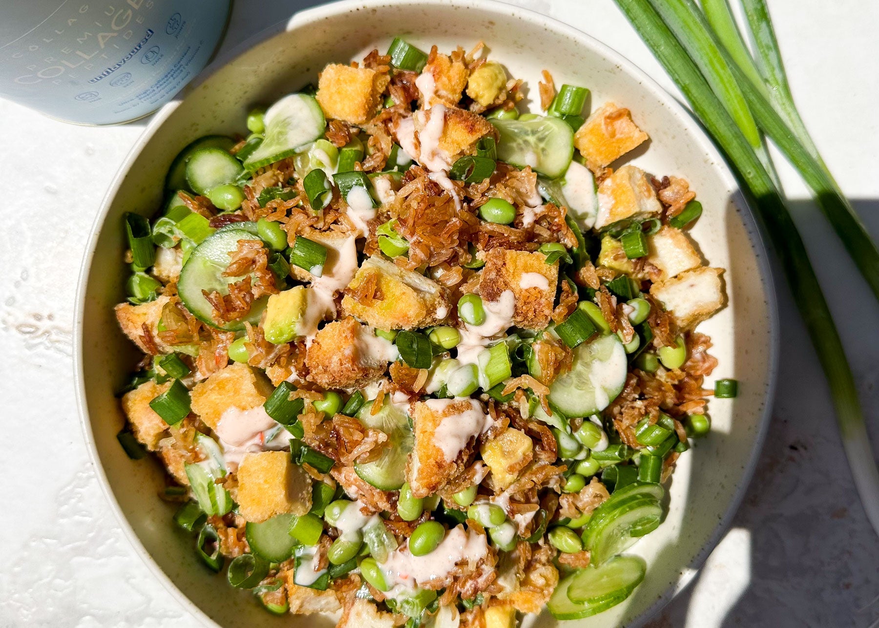 Golden crispy rice tossed with fresh cucumber, edamame, avocado and tender chicken, finished with a creamy sweet chilli collagen dressing. Crunchy, vibrant and packed with protein — a satisfying meal with the perfect balance of flavour and texture.